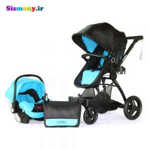 ست کالسکه اسپرینگ ۵ تیکه دارای پارچه بسیار عالی و سایه بان است که جلوگیری میکند از تابش نور به فرزند شما ، با قابلیت های تنظیم پشتی که ۲ حالت دارد نشسته و خوابیده ، کالسکه ای با ۴ چرخ که قابلیت جداشدن و نصب کردن راحت را دارد و کمربند ایمنی برای نگهداری از کودک بر روی کالسکه نصب است .